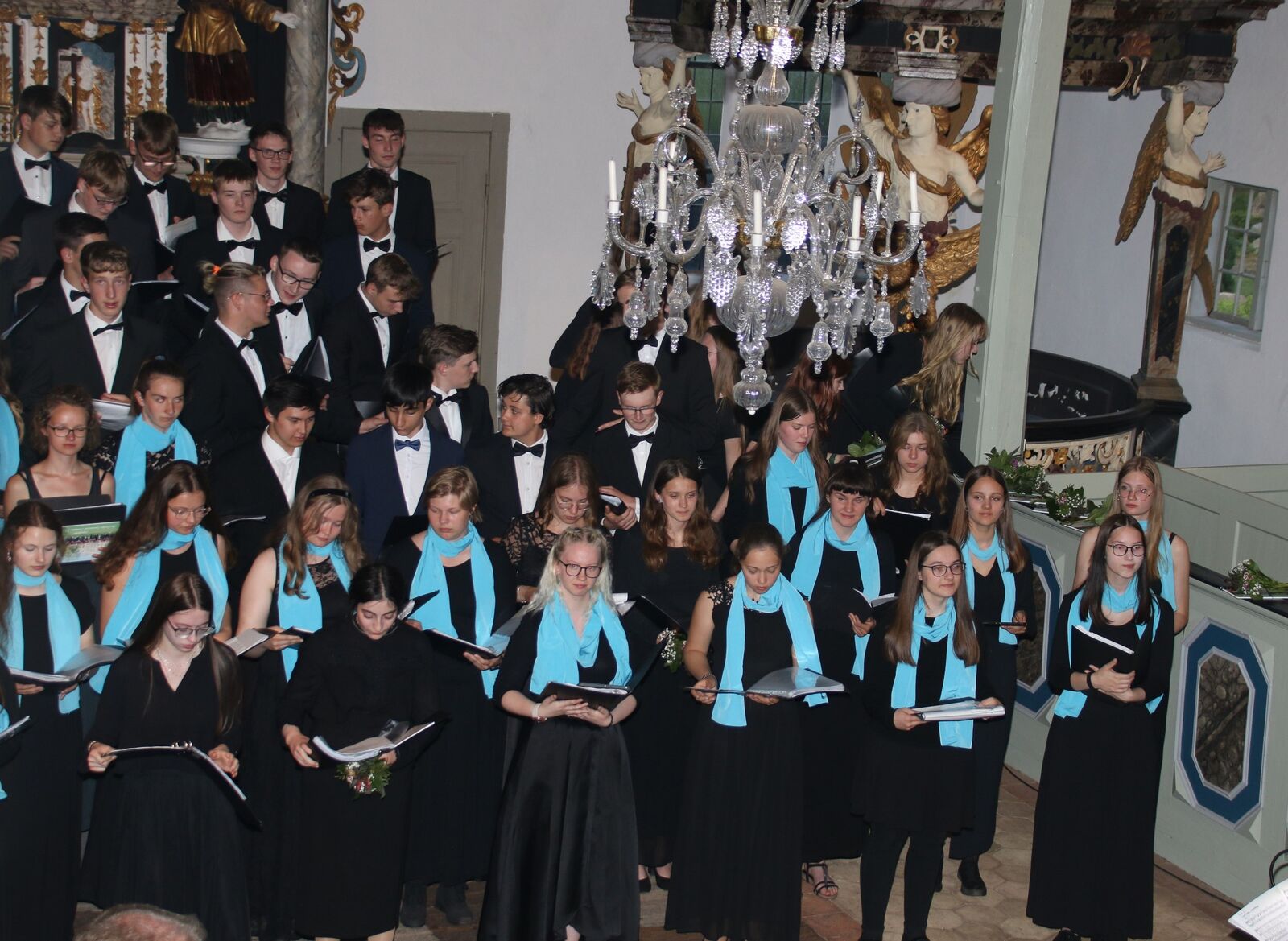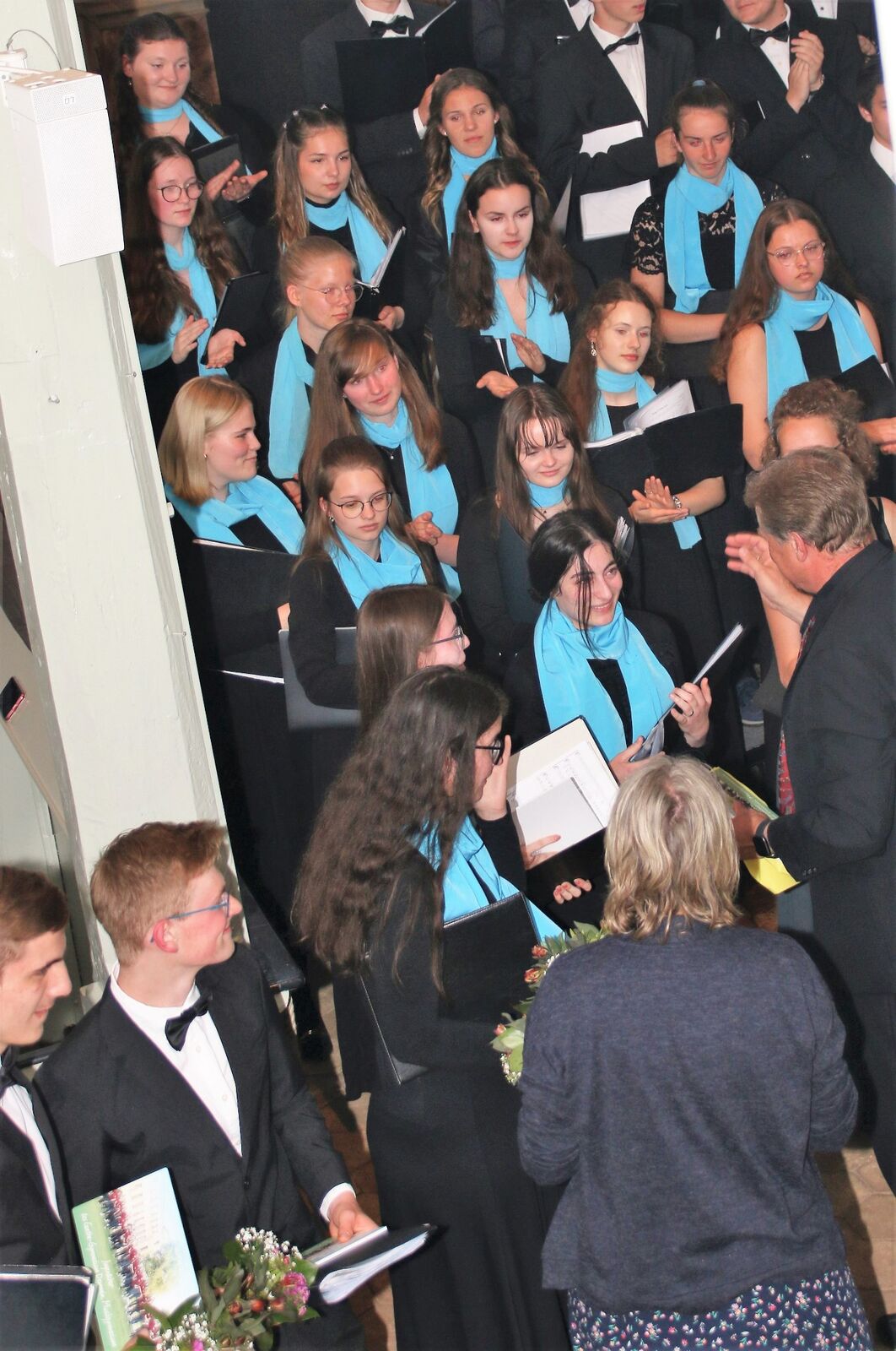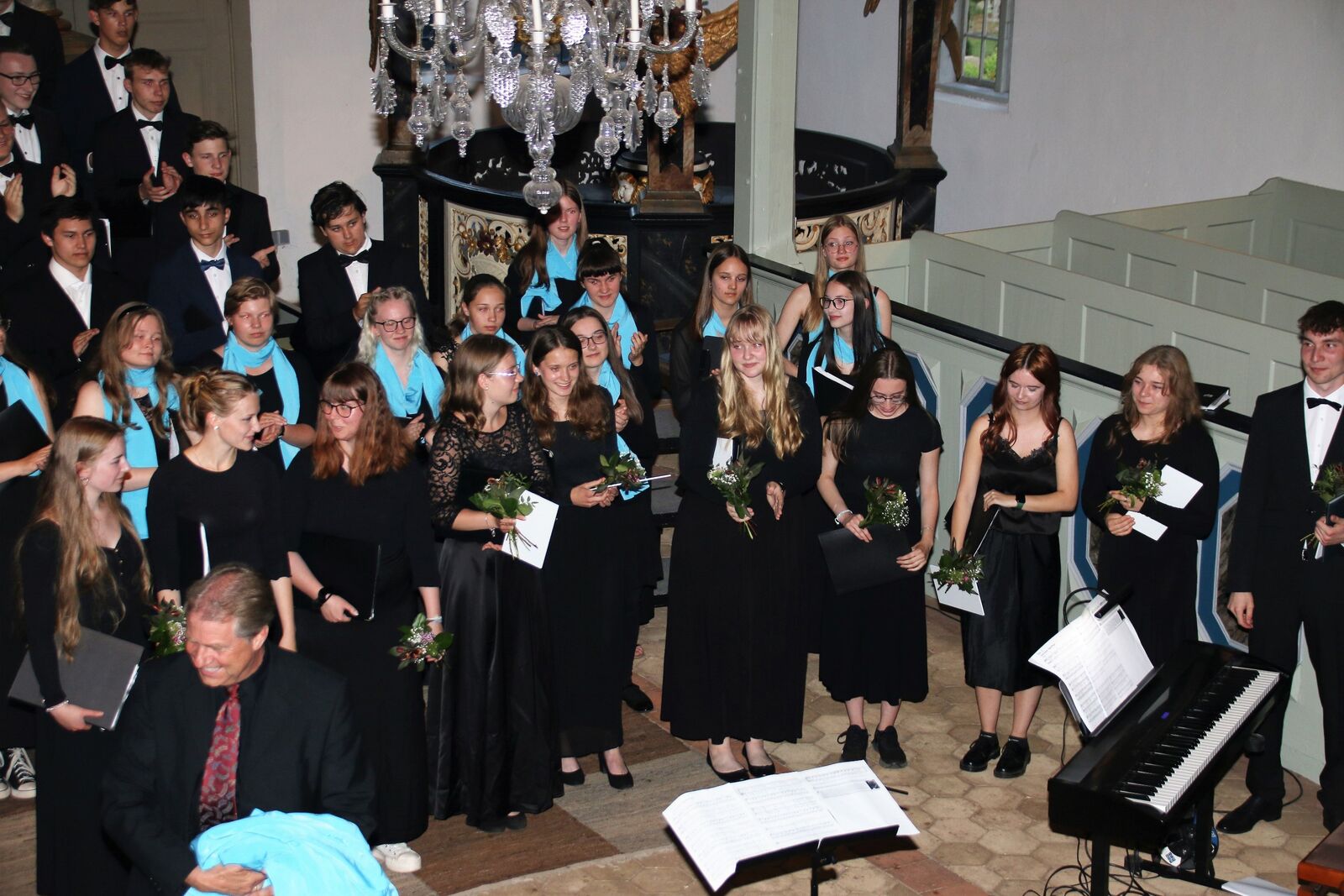 Was für ein Fest der Sinne! Wie ein wellenförmig ansteigendes Crescendo entwickelte sich am 09. Juni in der Konzertkirche in Prerow der gestaffelte Auftritt der einzelnen Ensembles – vom Mädchenchor, über das Terzett sowie die Schülerinnen und Schüler der Gesangsklasse von Frau Gnau bis hin zum volltönenden Jugendchor. Aus dessen Mitte trat dann die 12. Jahrgangsstufe heraus, die sehr emotional mit einigen Beiträgen Abschied nahmen. Anschließend wurden sie mit dem – lang vermissten Ritual – der Abgabe der Chortücher und Fliegen durch ihren Chorleiter und Frau Bobzin vom Förderverein verabschiedet.