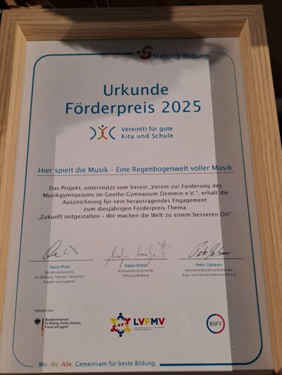 Eines Tages jedoch – und wie in jedem guten Märchen – klopfte das Glück an die Tür. Der Förderverein des Musikgymnasiums stellte einen Antrag bei der Stiftung Bildung. Und wie durch ein kleines Wunder erhielt er den Förderpreis 2025 für Mecklenburg-Vorpommern. Welch eine Ehre! Welch ein Triumph für diese Idee, die einst ganz klein begonnen hatte!