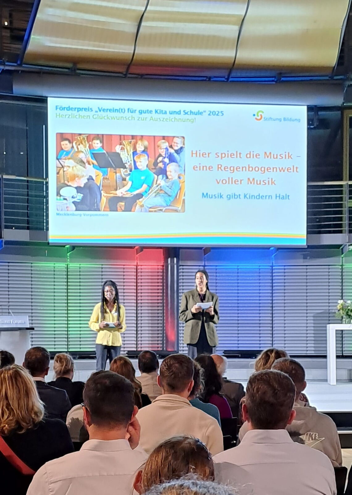 Am 28. November machte sich eine kleine Delegation auf den Weg nach Berlin: ein Erzieher und zwei mutige Kinder aus der Kita Kinderhaus Regenbogen, ein Lehrer vom Gymnasium und zwei Sechstklässler – gemeinsam reisten sie in die große Stadt, um den Preis entgegenzunehmen. Dort erwartete sie ein Rahmen, der so festlich und eindrucksvoll war, dass man sich beinahe wie in einem königlichen Saal fühlte.