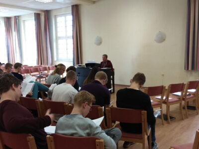 Traditionell nutzen die Sängerinnen und Sänger die Zeit in der Jugendherberge Burg Stargard, um sich auf die kommenden Konzerte vorzubereiten. So standen am ersten Tag die Weihnachtskonzerte, insbesondere das gemeinsame Konzert mit den Ehemaligen und ihrem Chorleiter und Gründer des Musikzweiges unserer Schule, Herrn Stefan Richter, auf dem Probenplan. Am zweiten Tag arbeiteten die Schüler unter der Leitung ihres Dirigenten Stefan Müller Teile aus der "Mass Of The Children" von John Rutter, welche dann gemeinsam mit allen Chören und somit allen Schülern des Musikbereichs, Solisten und dem Orchester zum Jubiläumskonzert am 22. März 2019 in der Konzertkirche Neubrandenburg erklingen sollen. Die Schülerinnen und Schüler der 12. Jahrgangsstufe absolvierten hier auch ihre Chorklausur. Mit dabei war für Stimmbildung, Korrepetition und Registerproben das Team des Jugendchores, Frau Gnau, Frau Bartuszewski und Herr Irmer, sowie die Kolleginnen Frau Lau und Frau Behrendt, die das Chorlager organisatorisch unterstützen.