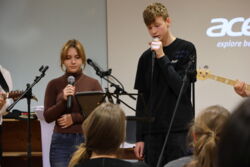 Gegen Mittag erreichten wir den Veranstaltungsort, das Boltenhagener Fritz-Reuter-Haus, welches durch sein Fachwerk und das Reetdach einen ganz besonderen Charme versprüht. Nach dem Aufbau der Technik, dem Bereitstellen der Instrumente und dem Soundcheck war es sogar noch möglich, über die Straße hinüber an den Strand zu gehen und frische Ostseeluft einzuatmen. Der Fachtag begann mit einem Klönschnack, der die Möglichkeit bot, sich untereinander über den Stand der Niederdeutschvermittlung auszutauschen. Die neue Fachreferentin für Niederdeutsch Ramona Mix und die neue Landesbeauftragte Nadine Koop eröffneten die Veranstaltung. Auch Bildungsministerin Simone Oldenburg richtete einleitende Grußworte an die Teilnehmerinnen und Teilnehmer. Einem Gastvortrag von Birte Arendt vom Kompetenzzentrum für Niederdeutschdidaktik der Universität Greifswald folgten verschiedene Auszeichnungen. Unserer Schule erhielt einen Preis für das Einreichen des Siegerwortes beim landesweiten Wettbewerb „Niederdeutsches Schülerwort des Jahres 2025“. Bei diesem hatten im Vorfeld Schülerinnen und Schüler Vorschläge einreichen und nach einer Vorauswahl durch eine Jury über ihren Favoriten abstimmen können. Gewonnen hat der niederdeutsche Begriff „Dœsbaddel“. Außerdem nahm unser Schulleiter Herr Sommer das Siegel für besondere Leistungen zur Pflege und Förderung des Niederdeutschen an Schulen entgegen. Die Ehrungen wurden musikalisch-kulturell unter anderem von Schülerinnen und Schülern unserer Schule gerahmt. Unsere Combo „Cre8ive“ hatte gemeinsam mit Herrn Koch im Vorfeld zwei Lieder einstudiert, deren Texte von der jetzigen Profilklasse 11 ins Niederdeutsche übertragen worden waren: „Nessaja“ (Peter Maffay) und „Frische Luft“ (Wincent Weiss). Martha Köpnick und Lena Gehrke präsentierten den selbstgeschriebenen Slam-Text „2 Johren, 11 Månden un 22 Dåch“. Die Darbietungen begeisterten das Publikum und wir konnten uns mit vielen positiven Rückmeldungen im Gepäck auf den Rückweg begeben.