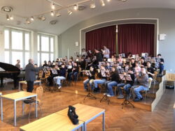 Die Initiatoren und Organisatoren um unseren Kollegen Andreas Rosin und Prof. Clemens Fuchs von der Hochschule Neubrandenburg hatten sich für das 29. Treffen etwas Besonderes ausgedacht. Erstmals fand die Auftaktveranstaltung in Demmin (!) statt. Unter der Leitung des schwedischen Saxophonisten Bernd Sjögren probten am Donnerstag unsere Bläser aus der 5. und 6. Klasse zusammen mit Bläsern der 7. Und 8. Klasse des Lessing Gymnasiums aus Neubrandenburg. Die fleißige engagierte Arbeit wurde anschließend in einem Konzert präsentiert. Mit Rhythmusgruppe und ca. 60 Bläsern brachten sie die Aula unserer Schule zum Beben.