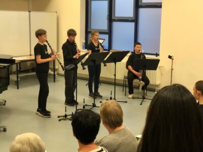 Dieses Konzertformat hat nicht unsere großen Ensembles im Programm, sondern gibt Schülerinnen und Schülern die Gelegenheit, ihr Können aus dem Instrumental - und Gesangsunterricht öffentlich zu präsentieren. So waren an diesem Vorspielabend Schüler von der 5. Bis zur 12. Klasse beteiligt. Die 12er, um schon einmal an der Auftrittssituation für das Abitur zu üben, die 5er, um wahrscheinlich zum ersten Mal allein oder in einer kleinen Gruppe, vorzuspielen. So waren die Beiträge entsprechend bunt gemixt was den Schwierigkeitsgrad und die Stilistik an ging. Im voll besetzten Chorprobenraum wurde das Publikum von Erna und Marit, die auch sängerisch in Erscheinung traten, durch das Programm geleitet. Besonders erfreulich, dass wir wieder ein spielfähiges Klarinettenquartett haben, dass mit drei Stücken den Abschluss des kurzweiligen Abends bildete. Wir danken den jungen Künstlern und ihren Lehrern, die diesen Abend möglich gemacht haben.